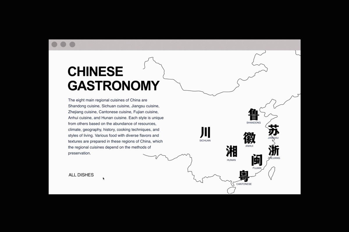 The landing page, which on the right listed the range of flavors in Chinese cuisines. As you scroll down, there will be a map informing the geographic locations of each cuisine. As you hover over the characters, the highlighted color implies the major flavors established in the cuisine. There are four dishes picked to represent each regional cuisine. You also can access the dishes by clicking all dishes to see the overview of all. Each row is assigned to one cuisine, where four squares are symbolizing the four dishes; as you hover over one of the squares, it will display the dish's name in Chinese and English.